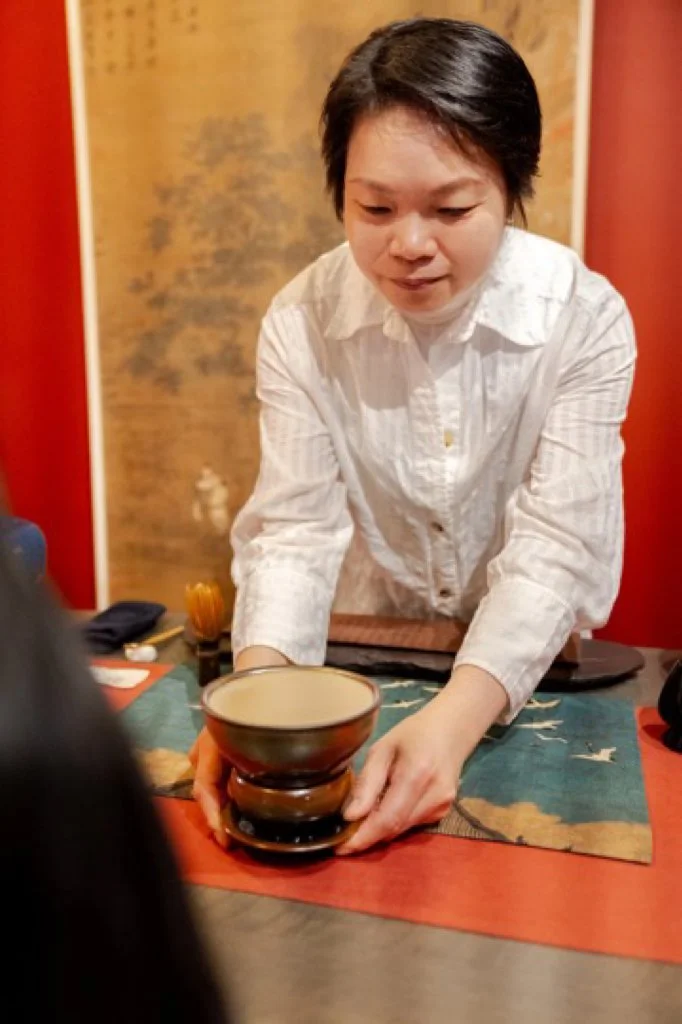 The tea master begins this ceremony by waking up the 熁碗 or “harmonious bowl” with boiling water. With delicate precision, she scoops tea powder with a teaspoon, placing small mounds in the middle of the empty bowl. Using a traditional hot water pitcher known as 湯瓶, she pours a splash and begins whisking. There are two different whisking techniques in this ceremony: 運筅 running the bamboo whisk around the bowl and 擊拂 striking the liquid to and fro. From the whisking, the water rejuvenates the tea as they form a perfect union and blossom into an exquisite foam delicate as fresh snowfall along the surface. This foam is called 茶乳 or the milk of the tea.