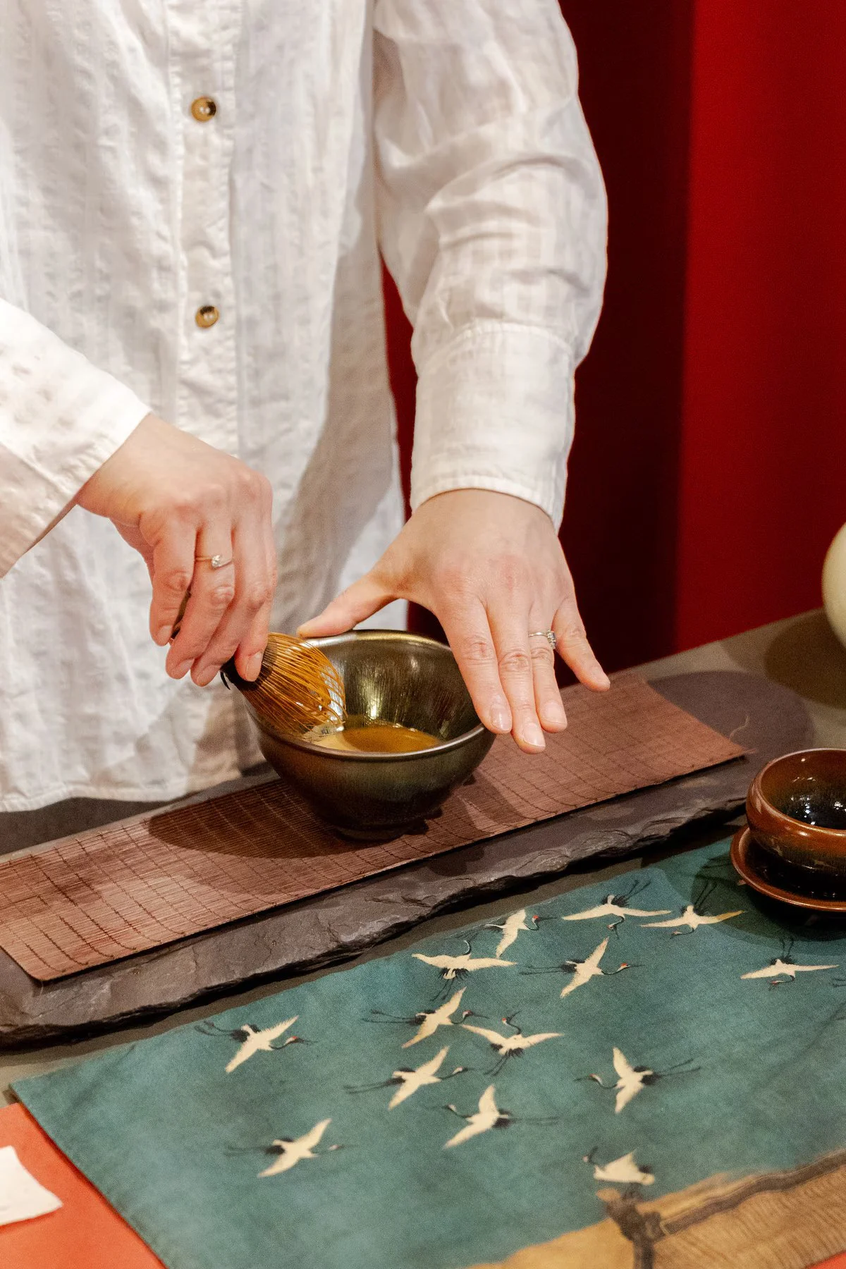 The tea master repeats the process, alternating between adding water along the liquid’s rising horizon and whisking. By the third round, the froth washes ashore the sides of the bowl. While some consider three rounds to be satisfactory, the true traditional ceremony requires seven—accumulating 200 whisks. As the tea master’s attention and posture is utterly receptive to the tea, her hand and the whisk become one—a conduit for the tea’s energy.